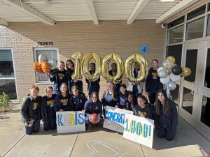 Shady Side Academy junior Karis Thomas (front, center) celebrates scoring her 1,000th career point with teammates on Dec. 1, 2024.
