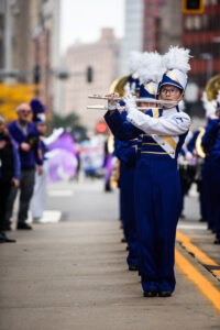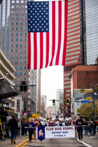 Plum High School marching band performs Saturday, Nov. 8, 2025 during the Pittsburgh Veterans’ Day Parade on Liberty Avenue.